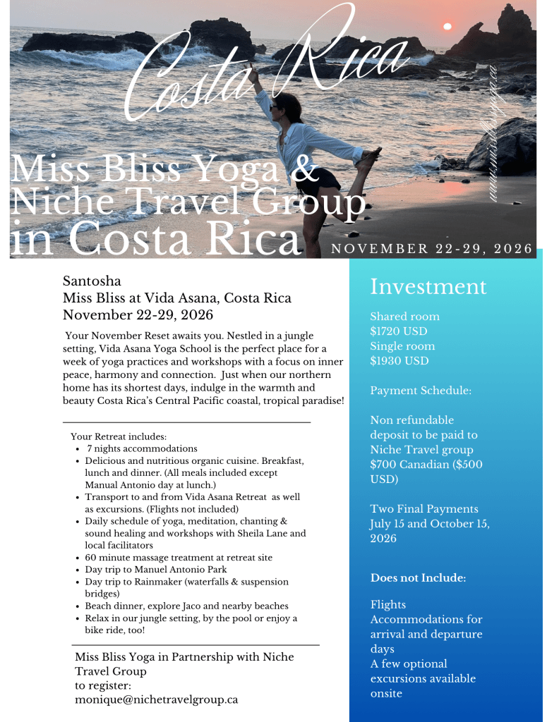 Events Upcoming Miss Bliss Yoga workshops, retreats and special classes. Join us this November in Costa Rica for our second retreat at Vida Asana, Central Pacific Coast https://www.vidaasana.com/programs#/event/2629/santosha-yoga-retreat Facebook Yoga Retreats in Hubbards Share this: Share on X (Opens in new window) X Share on Facebook (Opens in new window) Facebook Like Loading...